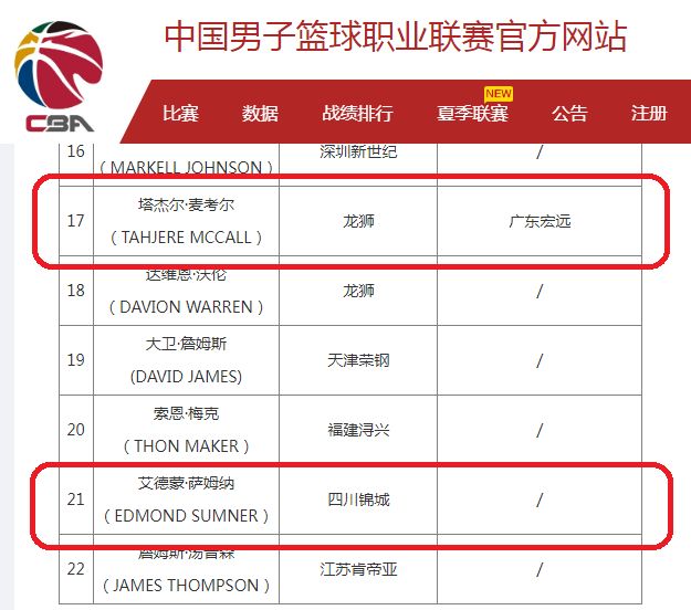CBA官方:广东获麦考尔优先续约权尚未交易到得分王萨姆纳