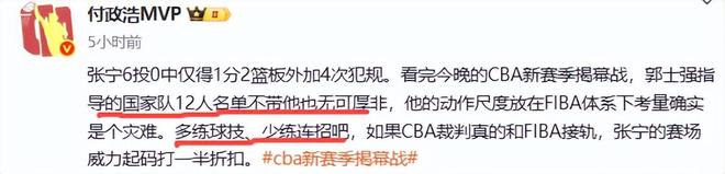 赛后山西一名队员遭到名记付政浩的点名批评。没错,他就是拿着600万年薪的张宁,从他的表现看,严重不适应FIBA体系下40分钟的比赛,这个体系下的比赛,犯规多就是灾难。张宁仅打了一节多就三次犯规,所以他只能下来坐板凳。不过全场他也打了20分钟,这个时间也不少了,是山西队出场时间第三多队员。但在20分钟内6投0中,4次犯规,仅通过罚球捡了1分,这数据完全对不起自己年薪。他那些大动作的犯规,以及投篮劈腿的动作更是遭到媒体人付政浩的批评。