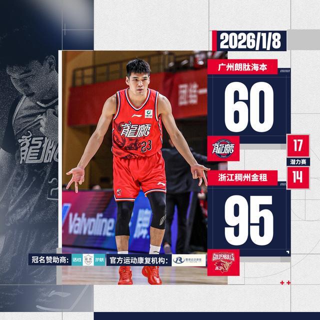 龙狮篮球俱乐部2026-01-08 22:05:072025-26赛季CBA常规赛第十二轮 — 主场不敌浙江广州朗肽海本60 : 95负于浙江稠州金租数据方面:威金顿14分5篮板5助攻,霍勒迪13分5篮板1助攻