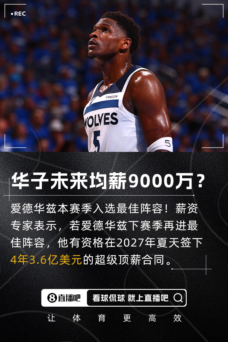 据薪资专家Yossi Gozlan报道,由于本赛季入选最佳阵容,爱德华兹正走在获得超级顶薪资格的路上,如果他2025-26赛季再次进入最佳阵容,那么他将有资格在2027年休赛期签下一份4年3.6亿美元的超级顶薪合同。