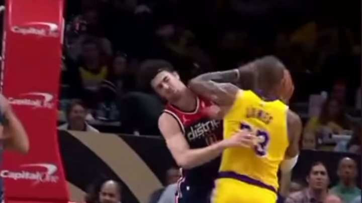 2024年4月,湖人客场挑战奇才,詹姆斯转身肘到阿夫迪亚脑袋,从进攻犯规升级一级恶意犯规。