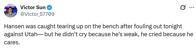 前方记者Victor Sun在社媒上发出了瀚森落泪的一幕,配文写道:“瀚森犯满离场后,坐在板凳席上哭了——但他哭不是因为他软弱,而是因为他在乎。”