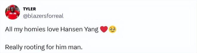开拓者球迷Tyler也写道:“我所有兄弟都爱杨瀚森,都在为他加油!”