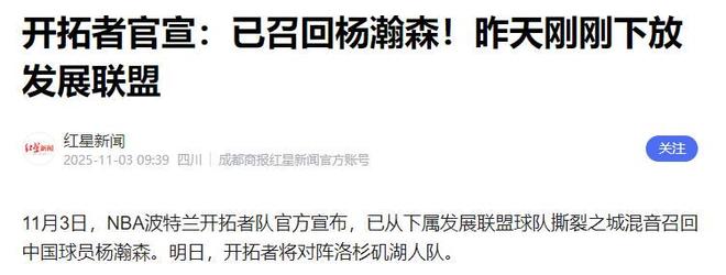 作品声明:内容取材于网络11月2日,开拓者官方突然宣布:将中国新秀中锋杨瀚森下放至发展联盟附属球队混音队。仅过24小时,11月3日球队便火速发布召回公告。这波“闪电下放+即时召