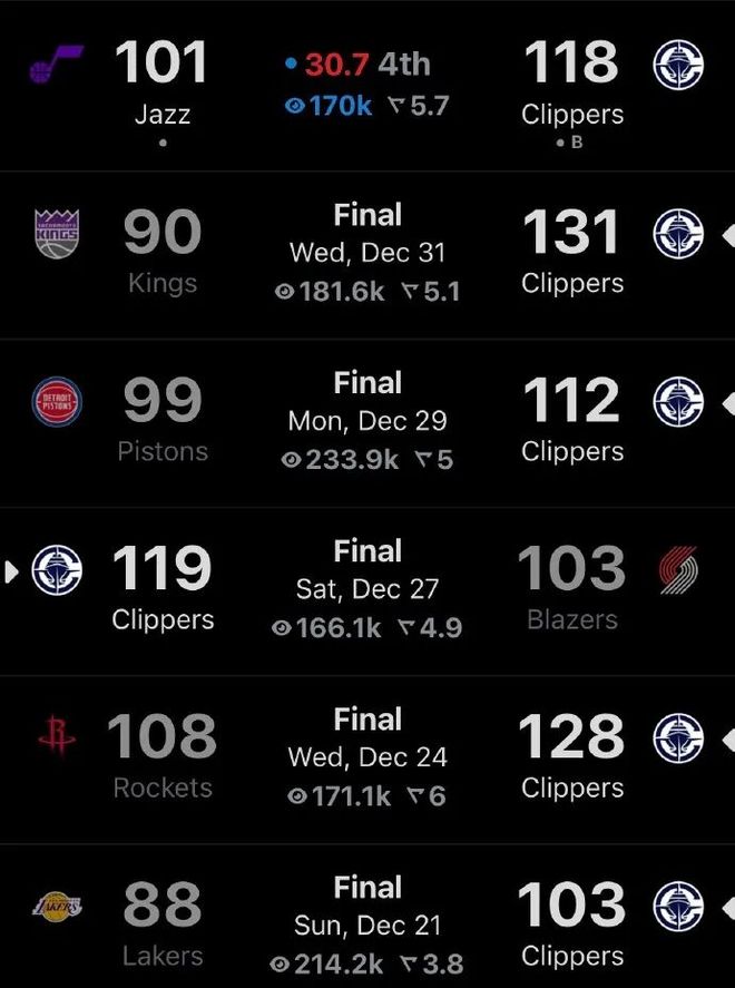 值得一提的是,在祖巴茨受伤的那场比赛以及休战的五场比赛里,快船全部赢球从而豪取六连胜,因此战绩从垫底位置飙升至如今的12胜21负位列西部第11,暂时落后第十的开拓者两个胜场。
