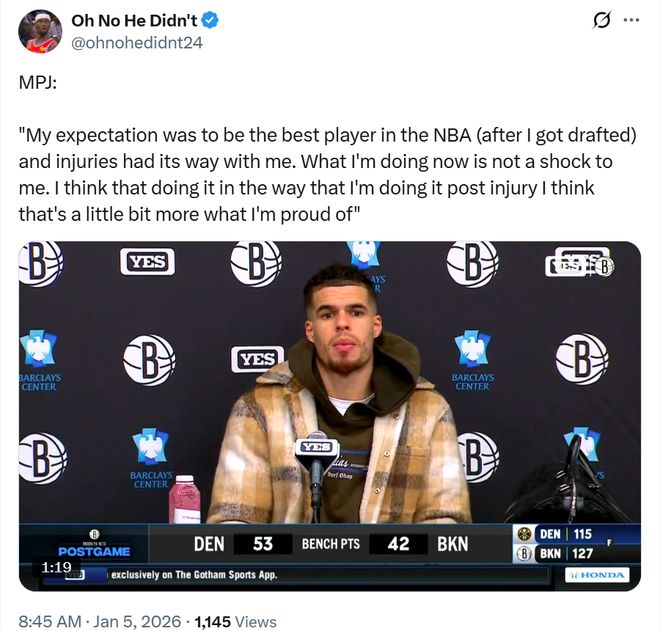 由于约基奇、卡梅隆约翰逊、瓦兰等数名核心轮换缺席,掘金队输给势头正盛的篮网并不让人意外。