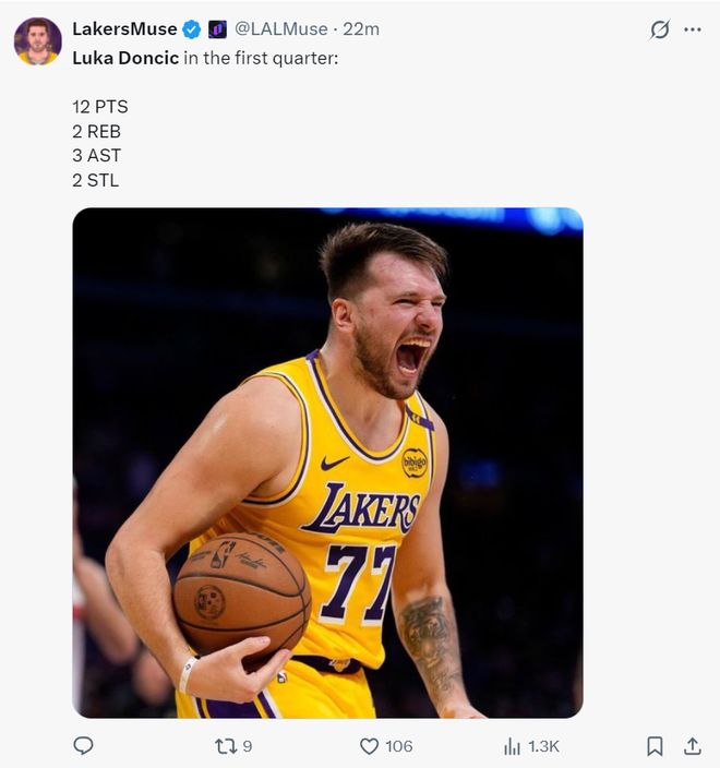 这是湖人背靠背的第二场,勒布朗-詹姆斯作为41岁的老将轮休了,东契奇独自带队,雷迪克让范德比尔特先发了,首节东契奇扛起球队,单节8中4+三分2中1+罚球5中3拿到12分2篮板4助攻2抢断,东契奇攻防两端非常卖力帮助球队紧咬比分。