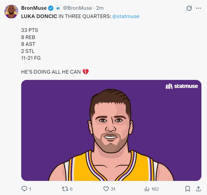 第三节东契奇打了11分钟,7中4+三分3中1+罚球3中2拿到11分2篮板1助攻,三节打完已经拿到33分8篮板8助攻2抢断的数据,湖媒很心疼东契奇:他正在竭尽全力。