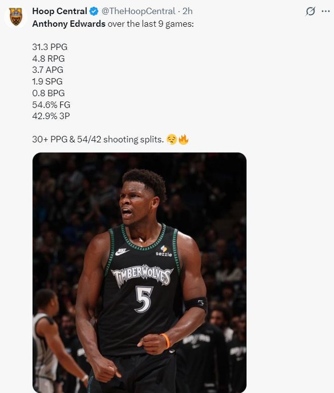过去的9场比赛,爱德华兹场均31.3分4.8篮板3.7助攻1.9抢断0.8盖帽,命中率54.6%,三分命中率42.9%,狼王狂妄是狂妄但他就是有狂妄的本钱。