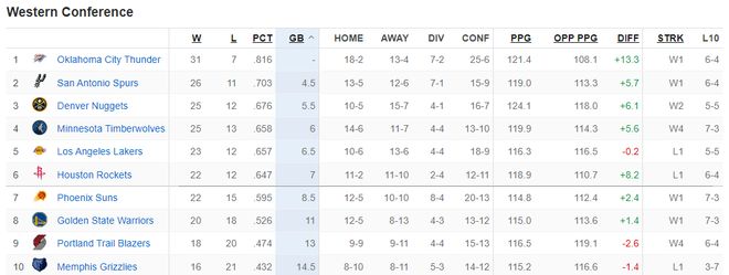 森林狼凭借这一波4连胜已经反超湖人升至西部第四的位置,火箭则掉至西部第六。