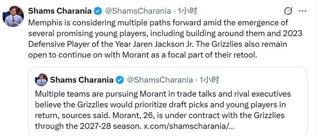 Shams表示,已有多支球队对莫兰特表达兴趣,灰熊队正权衡未来的建队方向:要么留下这位两届全明星球员,要么将其交易,围绕小贾伦-杰克逊和球队年轻核心重新打造阵容。他补充道,若灰熊最终达成涉及莫兰特的交易,目标将是换回年轻球员和选秀权。