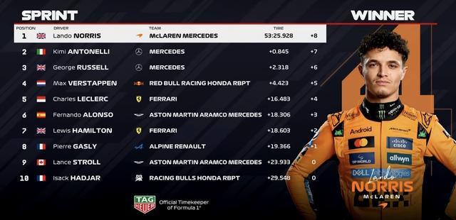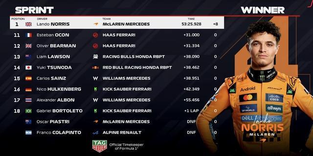 冲线!诺里斯在冲刺赛完成pole to win,与队友在积分榜上的差距扩大至9分!