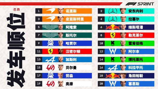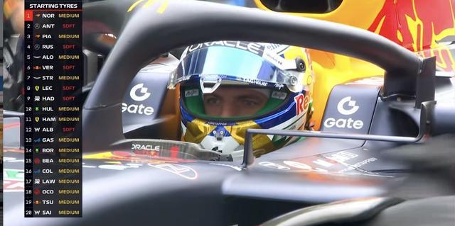诺里斯,安东内利包揽前排,身后的则是皮亚斯特里、拉塞尔。阿隆索、维斯塔潘处在第三排,角田、塞恩斯维修区起步。