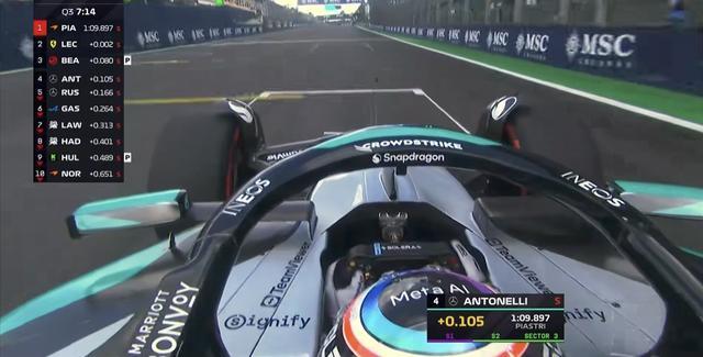 Q3首轮飞驰圈结束,皮亚斯特里领先勒克莱尔0.002秒暂居榜首,两台梅赛德斯排在第4&第5;