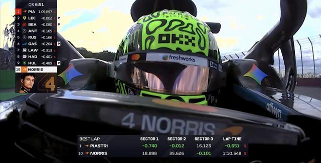 诺里斯在二三段刷紫,但因在1号弯前轮锁死导致损失0.89秒,排在第10;