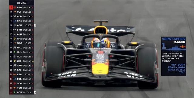 两台红牛先后冲线,角田排在第19,维斯塔潘只能排在第16,红牛双车Q1出局!!!