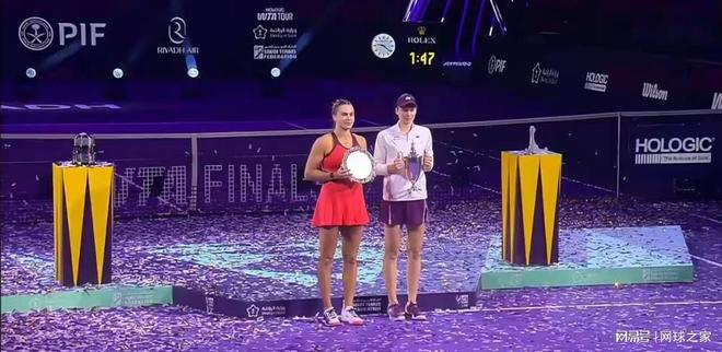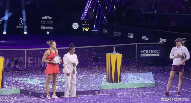 - 11月9日,利雅得WTA年终总决赛单打决赛,。合影环节,萨巴伦卡手捧奖杯与WTA首席执行官波西亚-阿彻合影时,莱巴金娜...发表于: 11-10 20:21