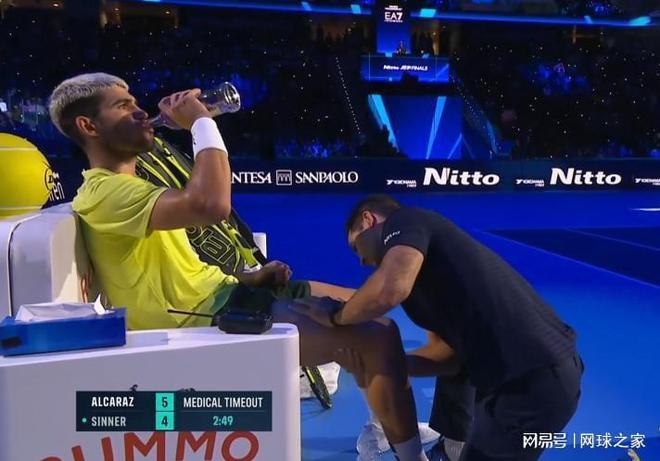 这场比赛一开始,双方就迅速进入状态,打得激烈胶着、精彩纷呈。第一盘前九局,双方各自保发成功,甚至都没给对方送出过一个破发点。不料率先发球、以5:4领先的阿尔卡拉斯,突然在局间休息时申请了医疗暂停,由进场的赛事防护员对其右大腿进行了按摩。