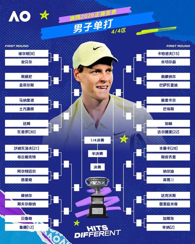 澳大利亚网球公开赛第一轮对决名单出炉,你心仪球员的签运如何?男单:小徳辛纳同半区;中国男网齐出击上半区男单前八号种子对位:【1】阿尔卡拉斯 vs 德米纳尔【6】【3】兹韦列夫 vs