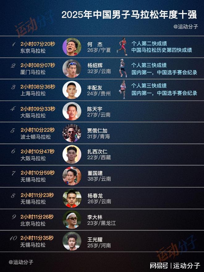 - 27岁的何杰、33岁的杨绍辉、24岁的丰配友,连续三年占据年度最好成绩TOP 3。他们毫无疑问是当下中国男子马拉...发表于: 01-24 12:18