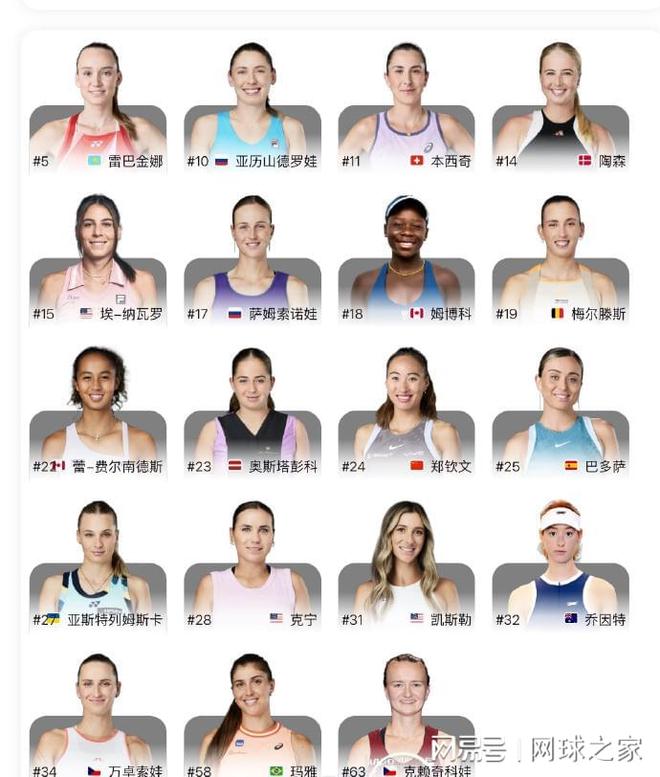从目前阿布扎比的参赛球员来看,整体阵容是相当豪华,除了郑钦文,还有莱巴金娜、亚历山德罗娃、克雷吉茨科娃、本西奇、陶森、纳瓦罗、萨姆索诺娃、姆博科、万卓索娃、梅尔滕斯、费尔南德斯、奥斯塔彭科、巴多萨、雅斯特雷姆斯卡、肯宁、玛雅、凯斯勒等大家非常熟悉的球员。