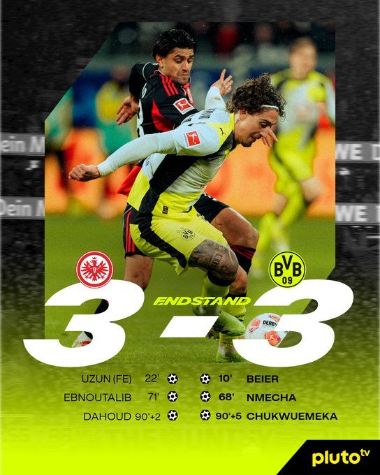 北京时间1月10日03:30,德甲联赛第16轮,法兰克福坐镇主场迎战多特蒙德。上半场,拜尔先拔头筹,乌尊点射扳平。易边再战,恩梅查建功,埃布努塔利布单刀再扳平,达胡德92分钟进球,库埃梅卡95分钟绝平。最终法兰克福3-3多特。积分榜方面,多特33分先赛落后榜首拜仁8分,法兰克福26分第七。