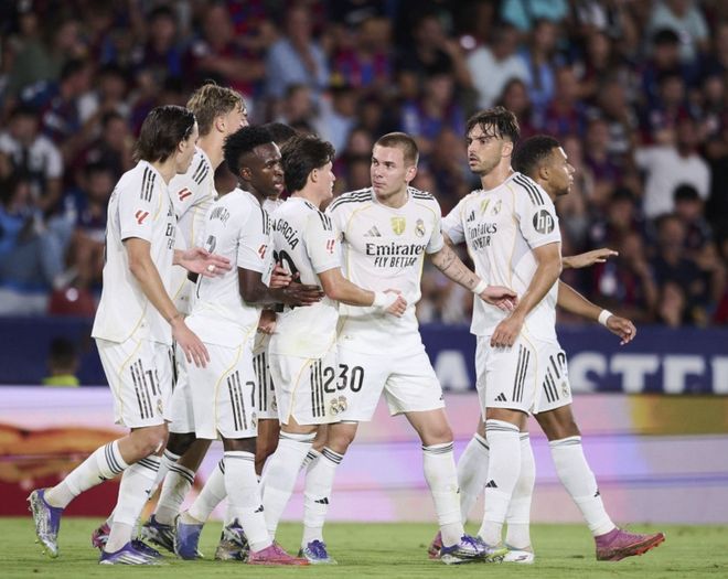 北京时间9月24日,西甲第6轮,皇马客场对阵莱万特。本场皇马的2名锋线球星站了出来,姆巴佩独中两元,维尼修斯传射,帮助皇马4-1大胜对手,18岁的马斯坦托诺打进皇马生涯处子球。枯坐板