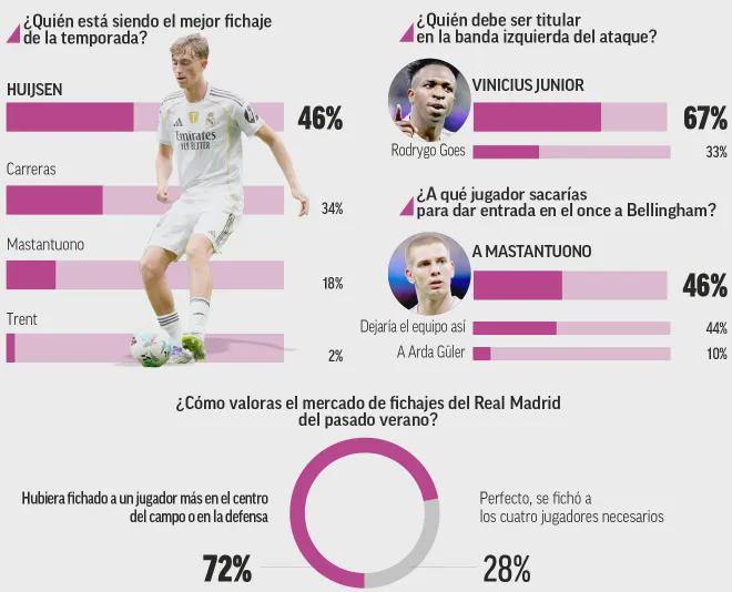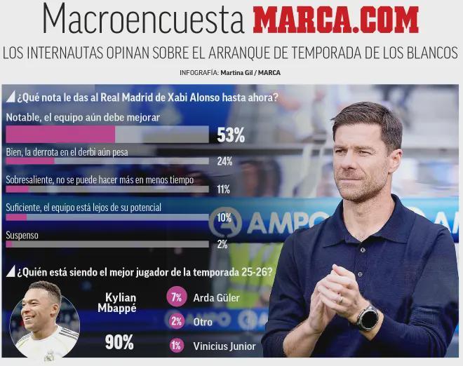 雷速体育10月8日讯 今天《马卡报》进行了一项民意调查,对皇马换帅之后的新赛季至今的表现进行了评价。 主帅阿隆索:表现出色:53%;表现平平:24%;表现杰出:11%;未能达标:10%;未来存疑:2%