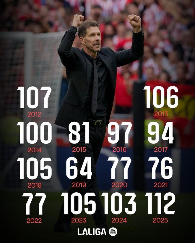 北京时间12月26日,来自西甲官方的统计指出,马德里竞技在2025年里各项赛事一共打进了多达112粒进球,这创造了自西蒙尼2011年12月接手球队以来,床单军团自然年正式比赛的进球数纪