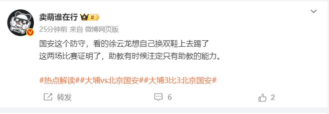 媒体人”卖萌谁在行“发文表示,国安这个防守,看的徐云龙想自己换双鞋上去踢了,这两场比赛证明了,助教有时候注定只有助教的能力。