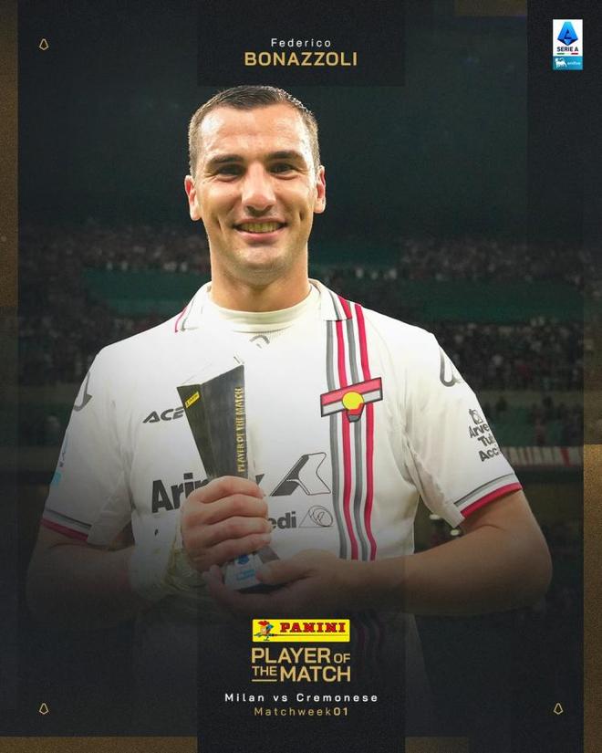 8月24日讯 2025-26赛季意甲首轮,克雷莫纳客场2-1爆冷击败AC米兰。赛后,本场比赛凌空破门的博纳佐利当选全场最佳球员。博纳佐利本场比赛首发出战,2次射门2次射正打进1球,另外他