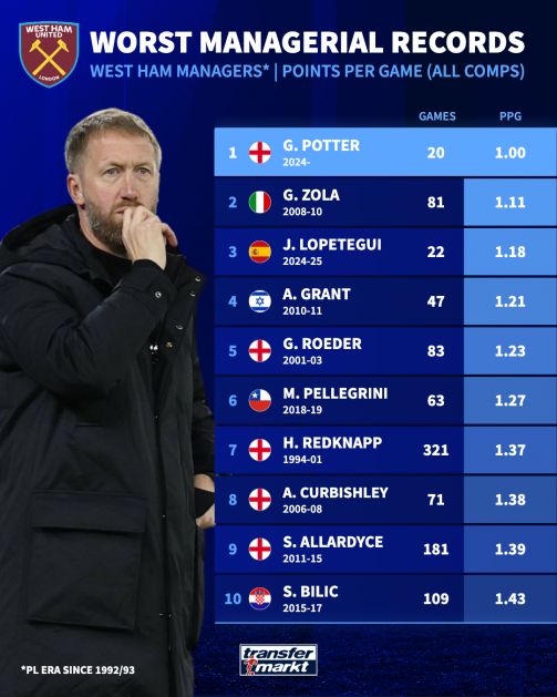 真要降级了波特场均得分为西汉姆联历任主教练最低