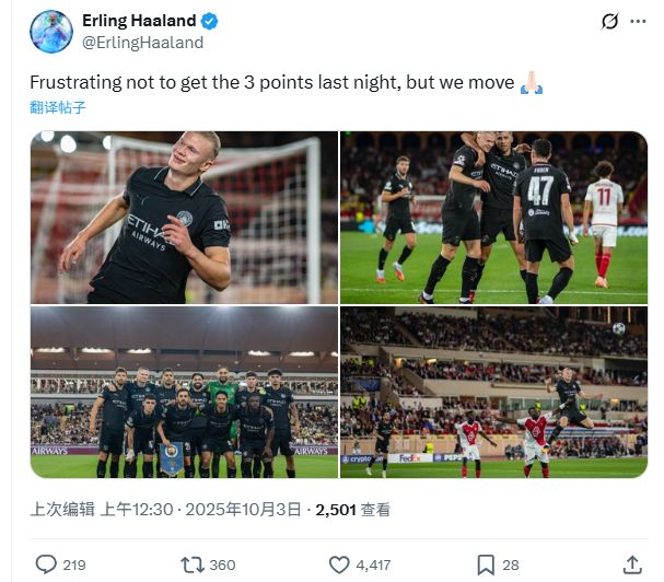 雷速体育10月3日讯 曼城在第二轮欧冠比赛中2-2战平摩纳哥,被对手90分钟点射绝平。哈兰德完成梅开二度难救主。哈兰德更新社交媒体写道:“昨晚没能拿到三分很沮丧,但我们会继