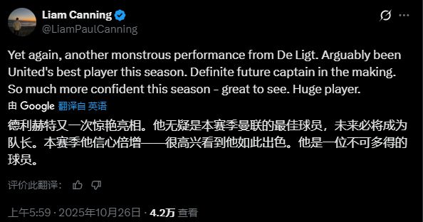 近日,知名曼联球迷、内容创作者利亚姆•坎宁(Liam Caning)将目光锁定在了德里赫特身上。德里赫特比B费年轻五岁,在曼联有着光明的未来。他认为德里赫特本赛季的表现“如怪兽般强悍”,称他是“曼联本赛季最佳球员”,并认为这位后卫是红魔“未来的队长”。