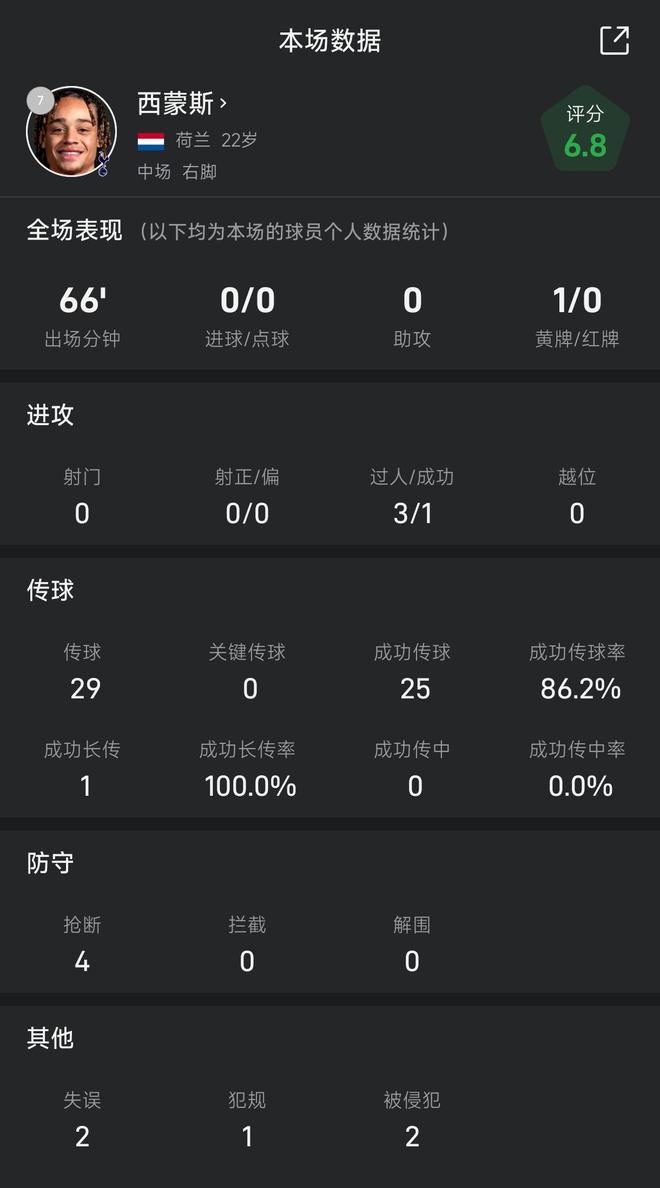 雷速体育11月2日讯 在今天凌晨进行的热刺主场vs切尔西的英超比赛中,哈维·西蒙斯第7分钟替换上场表现平淡,在第73分钟被换下。西蒙斯战切尔西全场数据:出场66分钟;3次过人尝试,1
