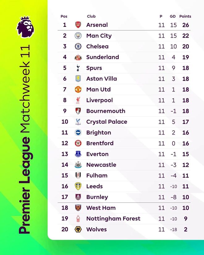 本轮过后,目前枪手依然领跑英超积分榜,曼城落后4分位居第二位,切尔西20分排在第3名,桑德兰19分排在第4位,从第5名到第9名的球队,全部积18分,竞争异常激烈。