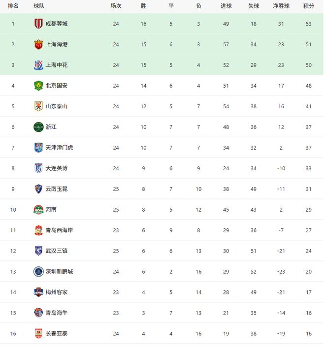 随着武汉三镇25,大连英博11,中超积分:3队角逐冠军,5队保级