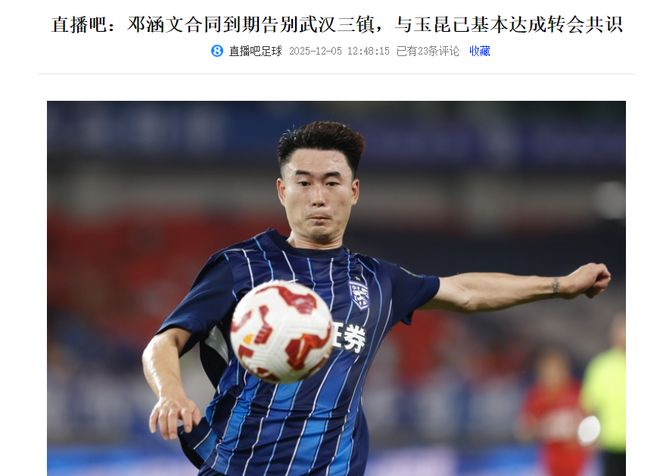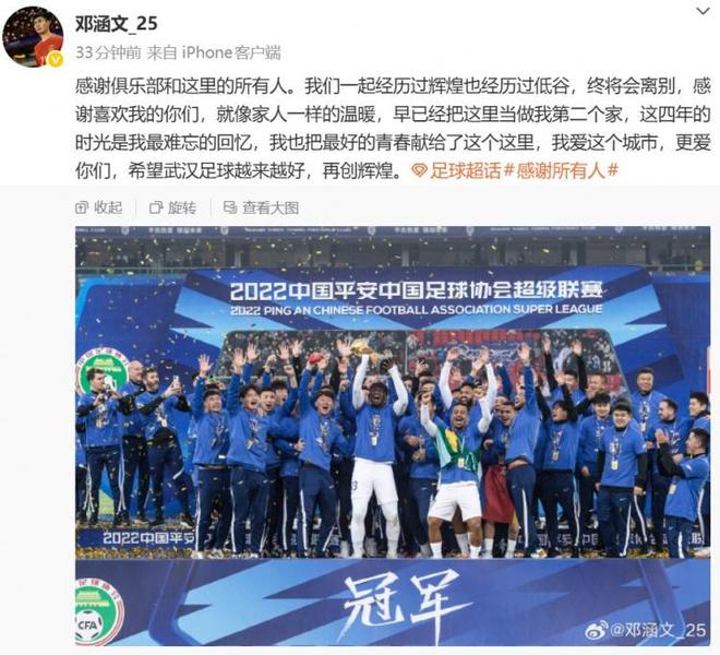 这还不止,据《》独家消息,邓涵文在合同到期后,他将会告别武汉三镇,新赛季有望加盟云南玉昆,而就在昨天(12月4日),邓涵文在社媒上已经正式与武汉三镇告别,他表示在武汉三镇这四年的时光,是他最难忘的回忆。