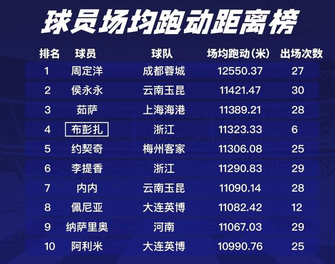 这个数据其实就是来自周定洋奠定的优势,他是上赛季中超场均跑动唯一一名超过12500米的球员,比第二名场均多跑超过1000米。